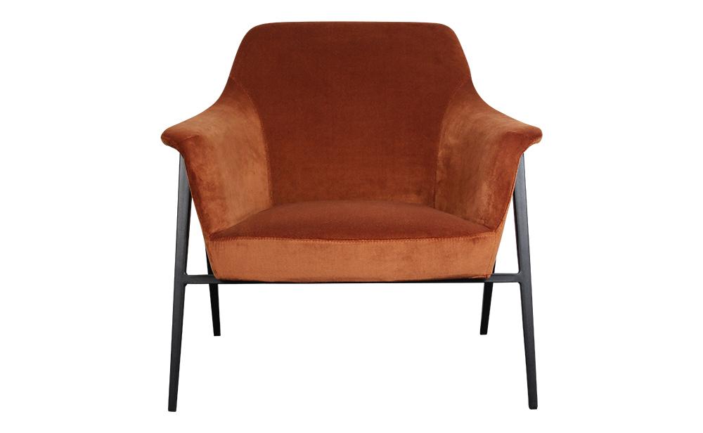 The Kew Armchair brings that industrial touch, while combining it with a more contemporary shape. Available in a lovely brunt orange velvet fabric, fitted with black metal legs.