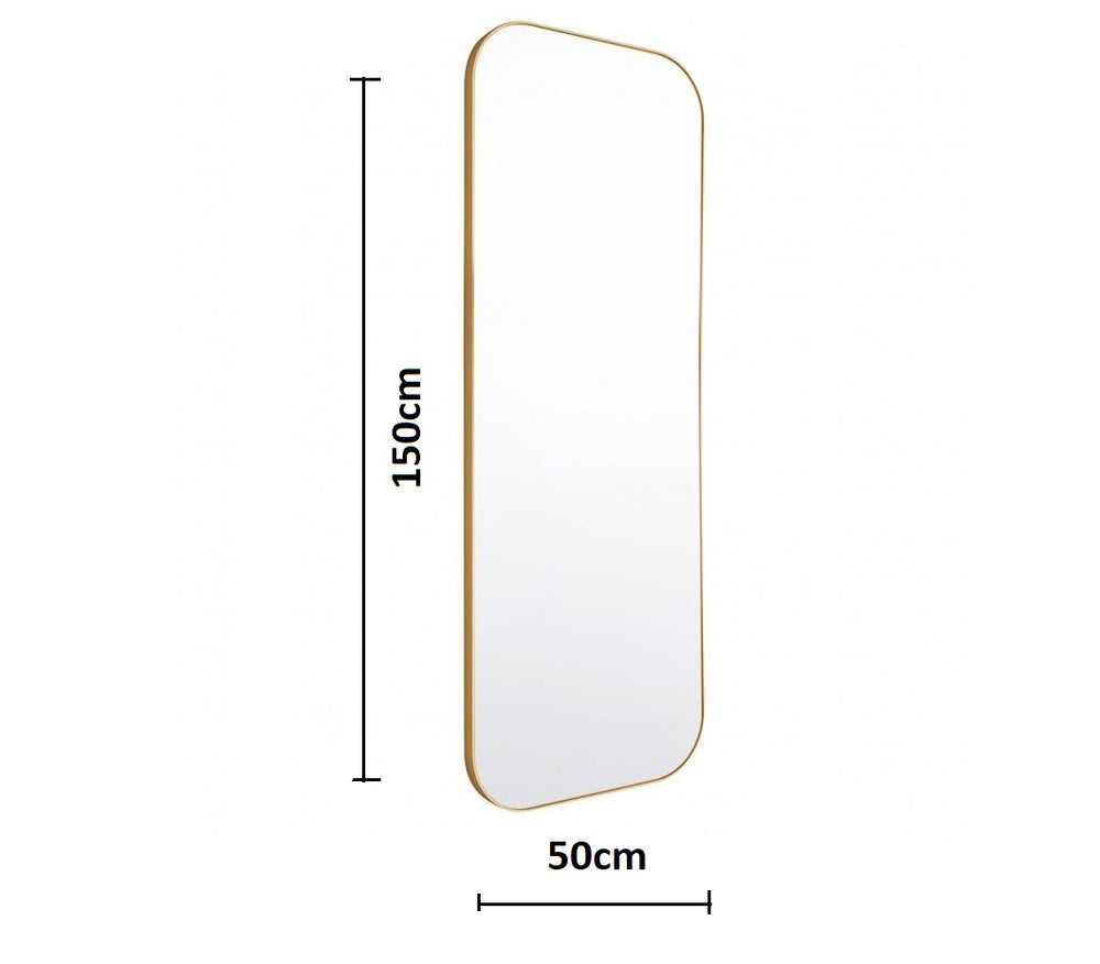 It is a full size mirror with a height of 150 cm. It has a thin, metal frame with rounded edges. Brushed with a golden colour that adds some glamour to your space and goes well with any other golden details in your home.