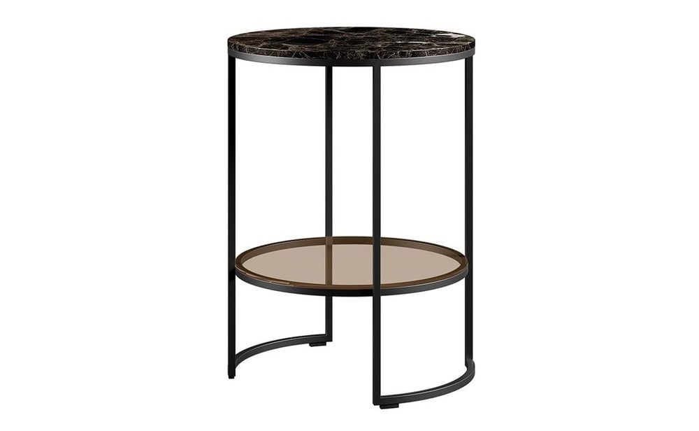 It has a marbled pattern, black top and a tempered glass shelf for some additional surface and decorative space. The frame and legs are made of black metal. A nice and versatile piece of furniture that could also be used as a bedside table.
