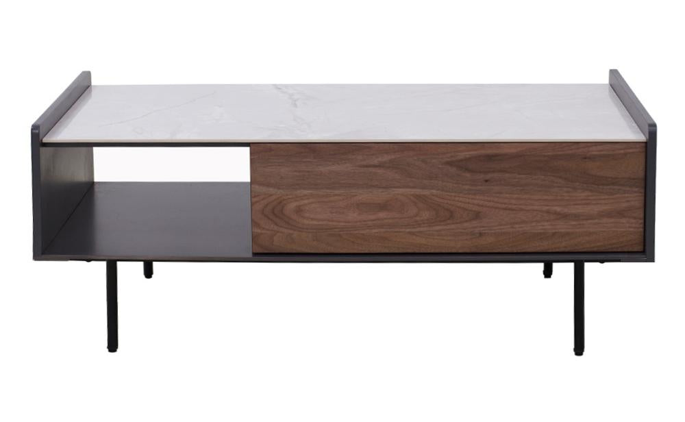 It has a smooth white, marble effect ceramic top accompanies by lovely walnut detailing. Walnut coloured drawer, matte grey body and black legs.The functional shelf also provides some useful storage.